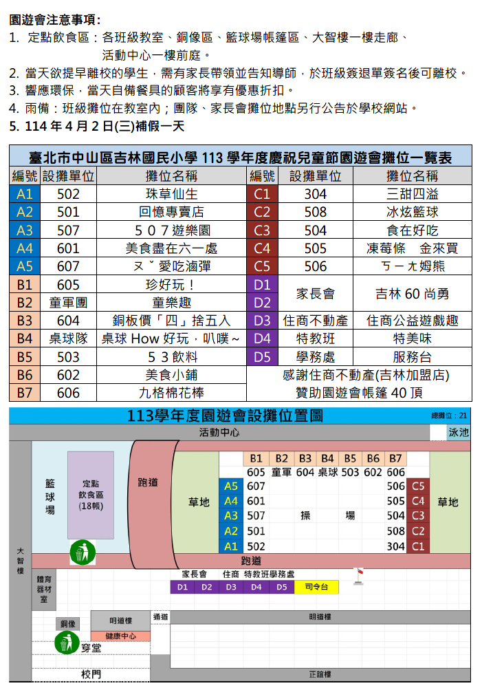 ※4/2(三)為兒童節園遊會補假,當天之週三課後照顧班與課外社團課程不上課 (未收費)