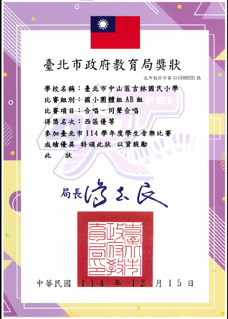 本校合唱團於113學年度臺北市學生音樂比賽榮獲同聲合唱西區優等