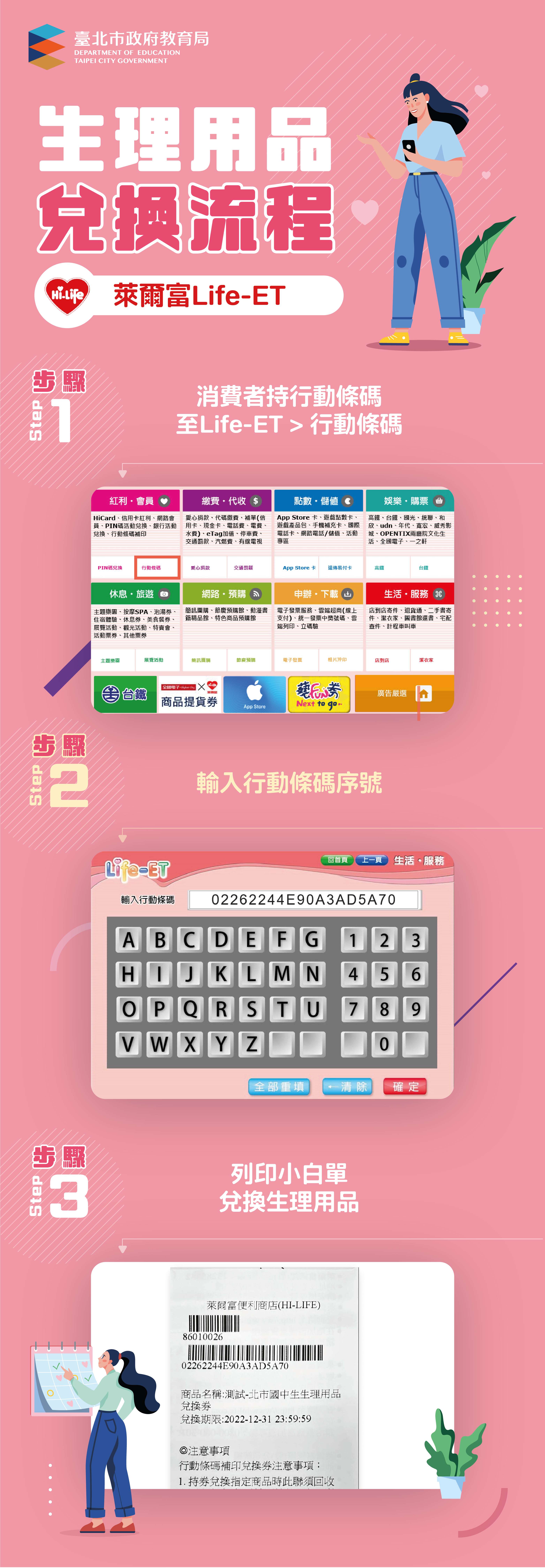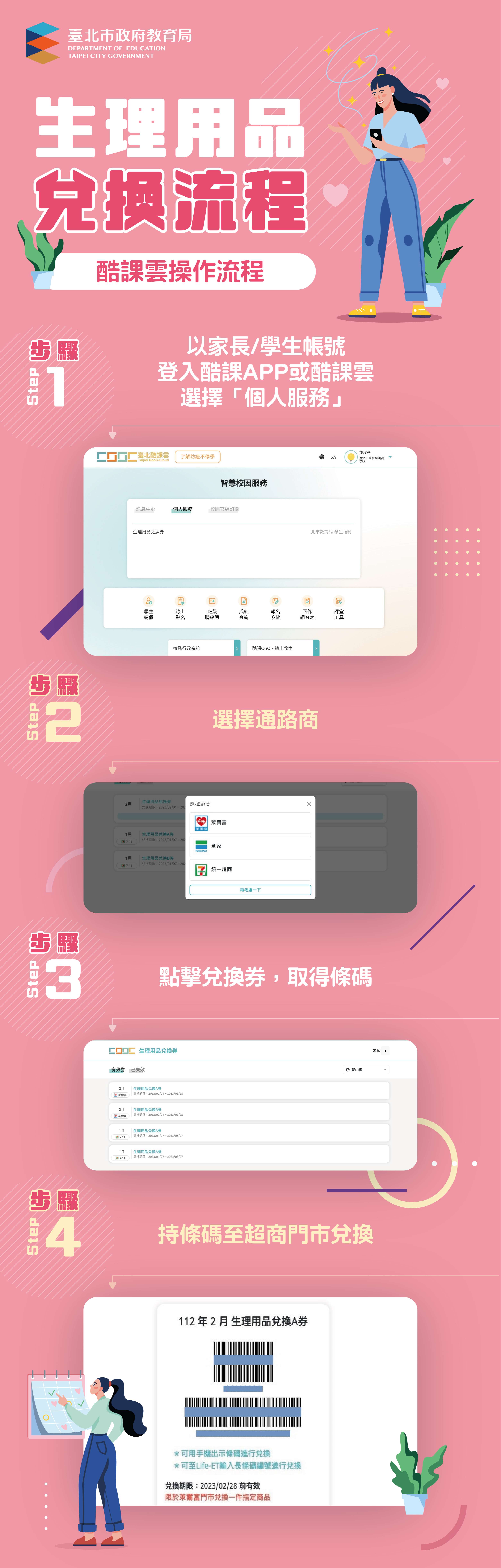 (四)使用方式:每月2張兌換券,每張100元,每券可兌換指 定生理用品一項,不接受補差額或要求找零,亦無法與門市其他促銷優惠同時使用。