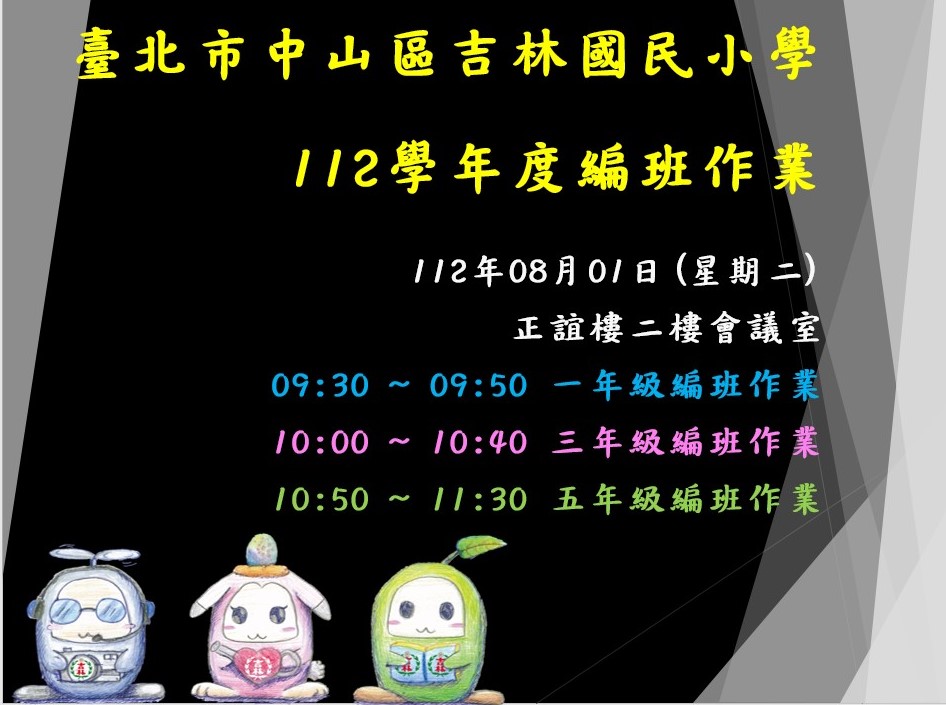 將於112年8月1日(二)上午進行112學年度一、三、五年級公開編班作業,各年段編班時間如圖,歡迎各位家長與會。