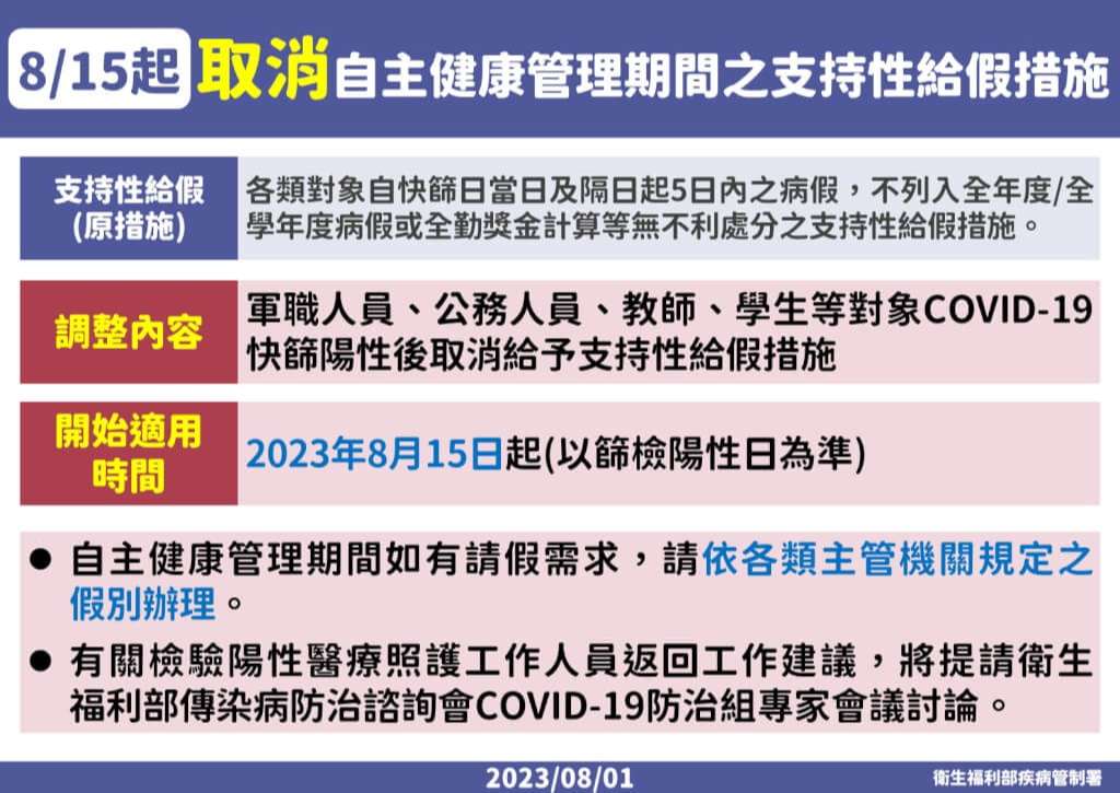 二、衛生福利部宣布自112年8月15日起COVID-19篩檢陽性輕症/ 無症狀者,取消各類對象自主健康管理期間之支持性給假措施,自主健康管理天數由10天調整為5天