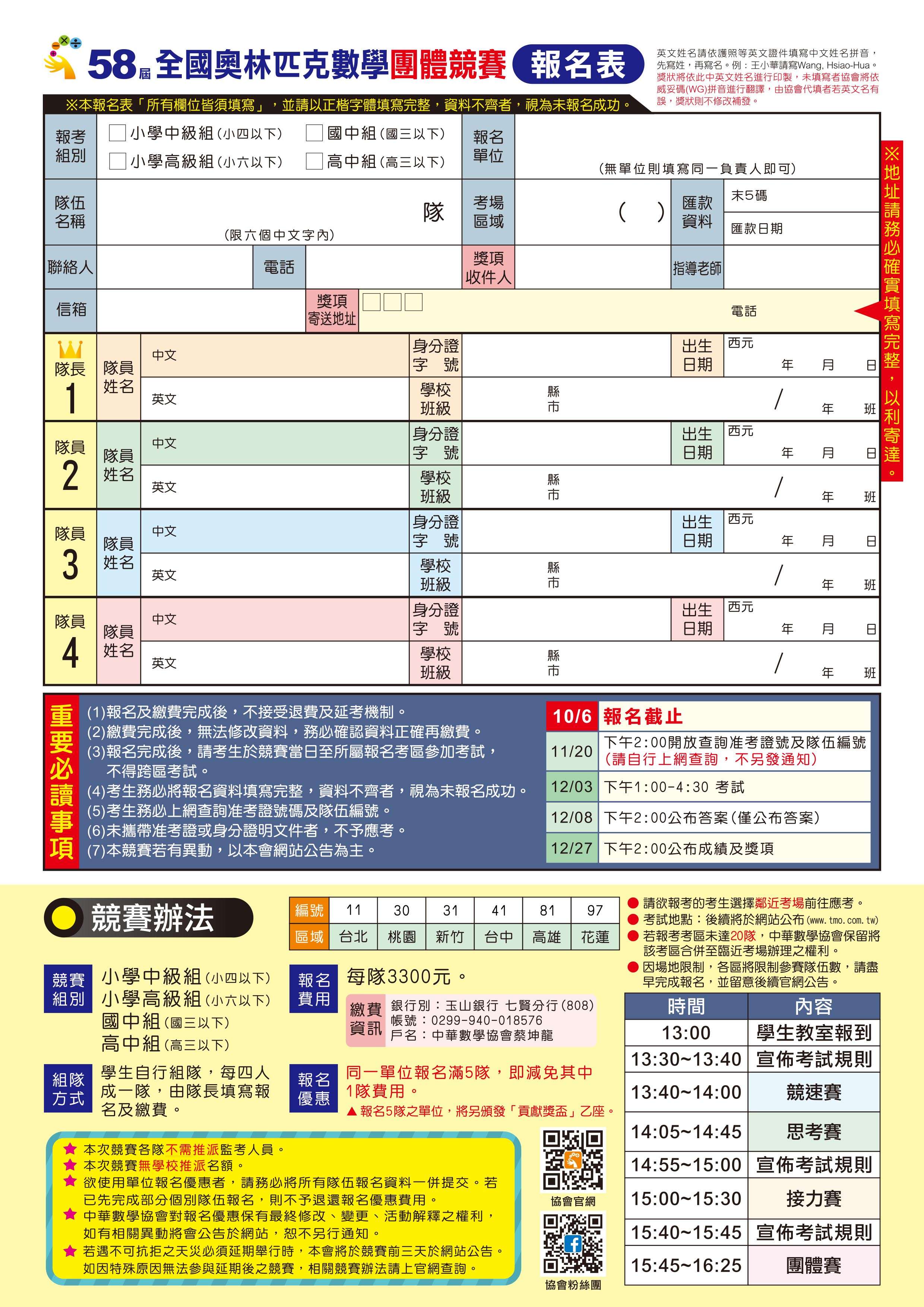 謹訂於112年 12月3日(日)舉辦 「第58屆全國奧林匹克數學團體競 賽」,旨在培養學童對數學的興趣,為國家培育優秀人 才。