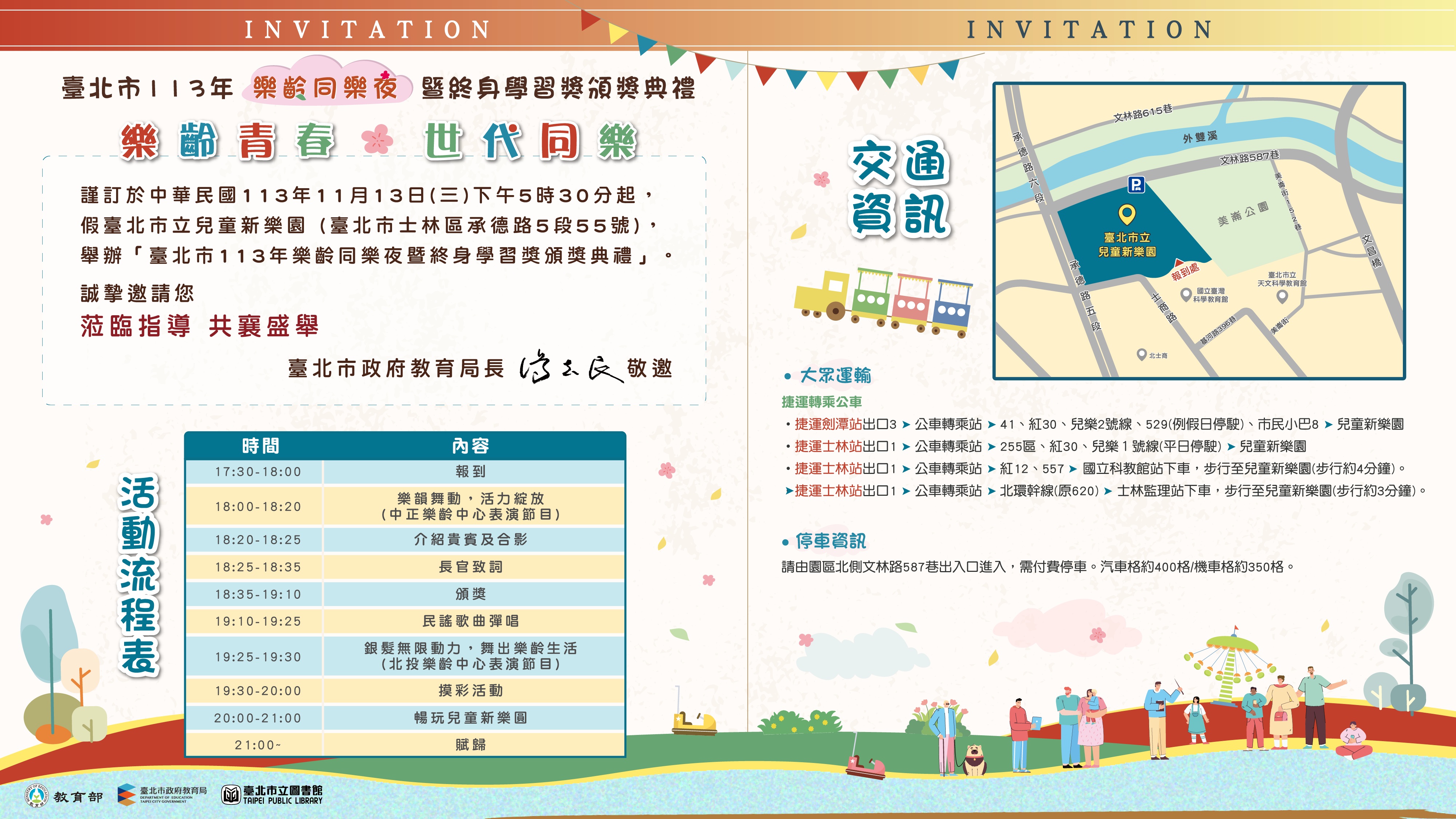 有關「臺北市113年樂齡同樂夜暨終身學習獎頒獎典禮」,說明如下: