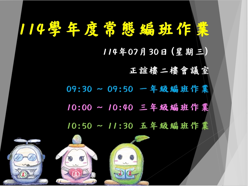 將於114年7月30日(三)上午進行114學年度一、三、五年級公開編班作業,各年段編班時間如圖,歡迎各位家長與會。