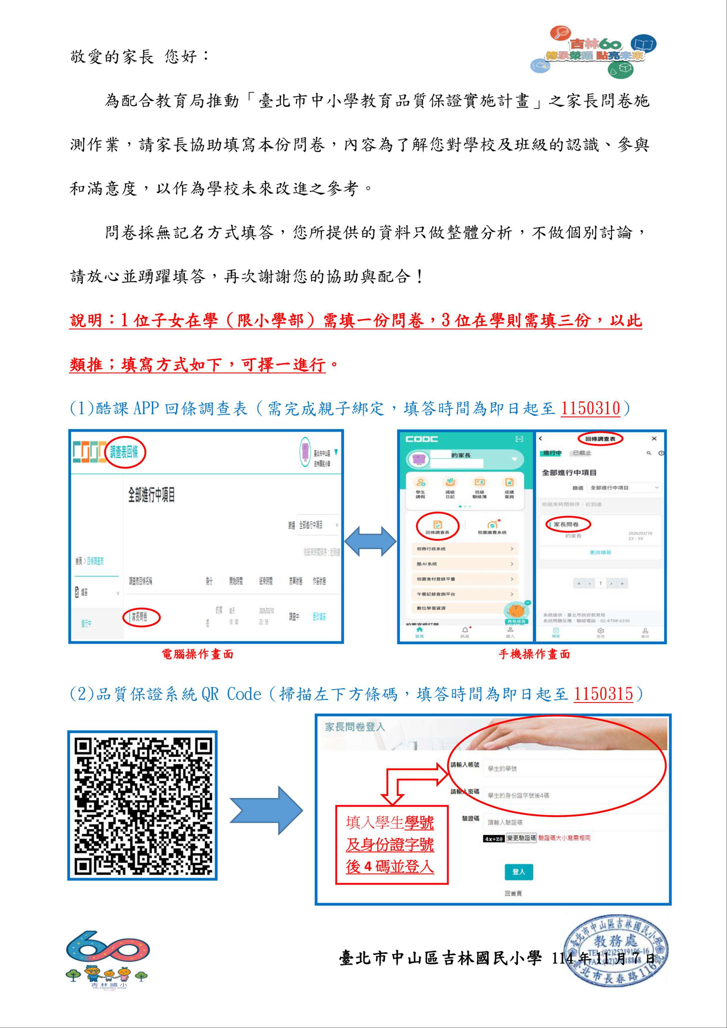 為配合教育局推動「臺北市中小學教育品質保證實施計畫」之家長問卷施測作業,請各位家長協助填寫本份問卷(子女為小學部在學為限),填寫說明可參閱附件,請踴躍填答,再次謝謝家長的協助及支持!