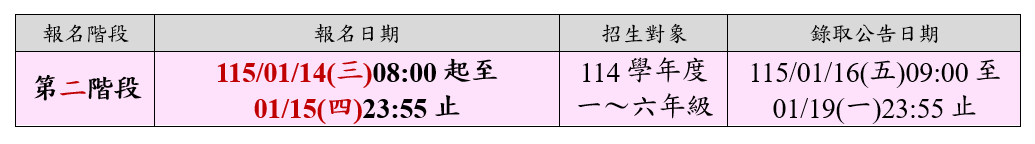 因應臺北市校務行政系統將於115/01/20關閉,修正第二階段報名時間如下: