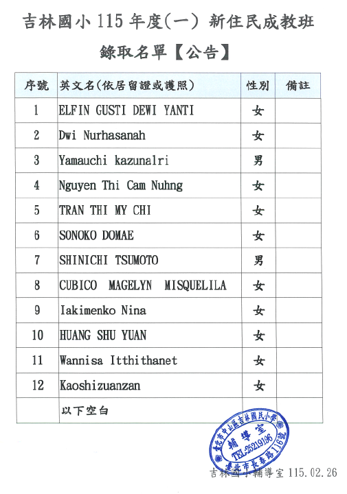 恭喜各位完成錄取吉林國小115-1新住民成人教育班課程,錄取名單如附件。
