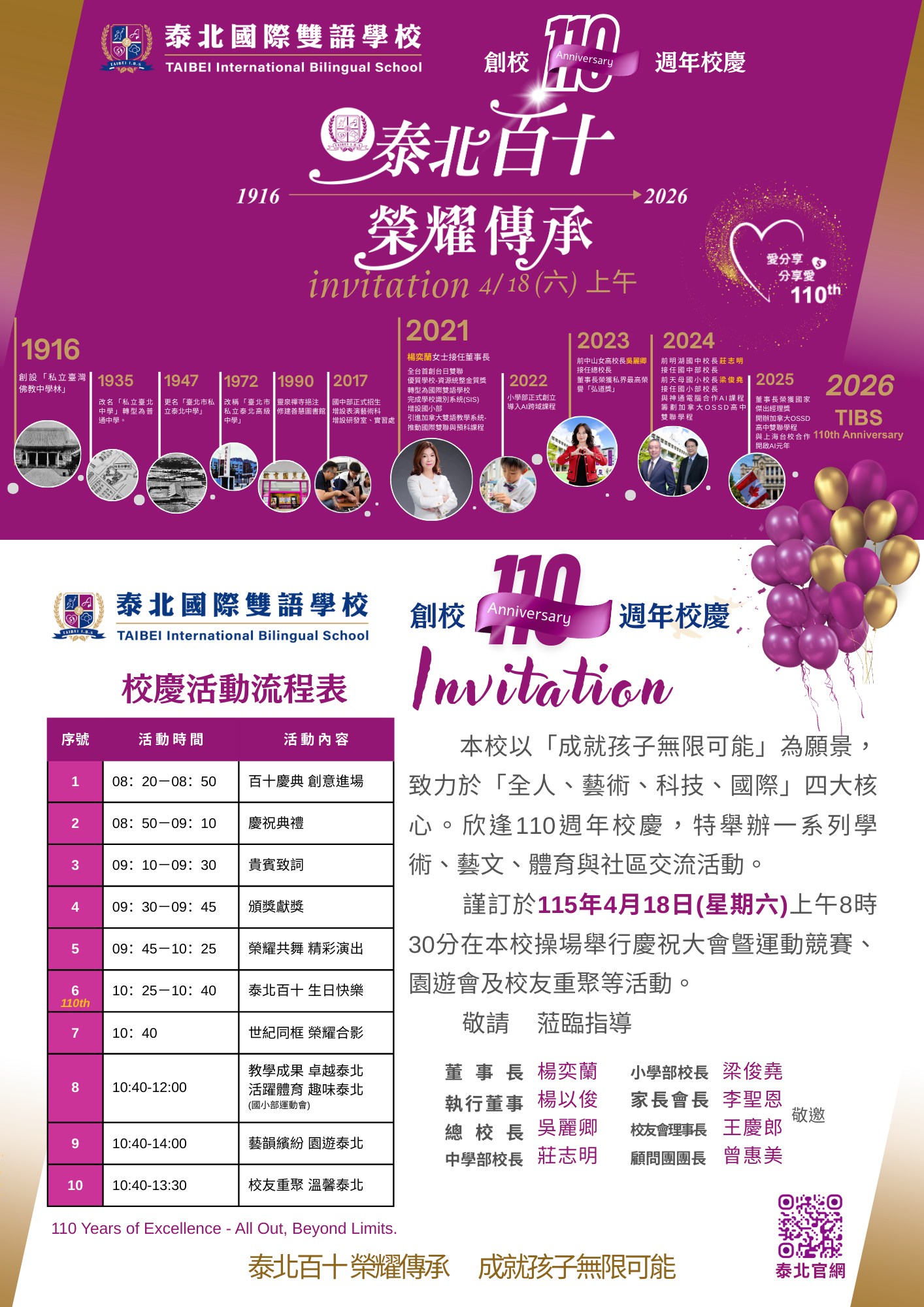 臺北市私立泰北高級中學115年4月18日舉辦110週年校請活動,有意參加者請於4月2日向本校總務處文書組報名彙整參加人數回報泰北高中~謝謝
